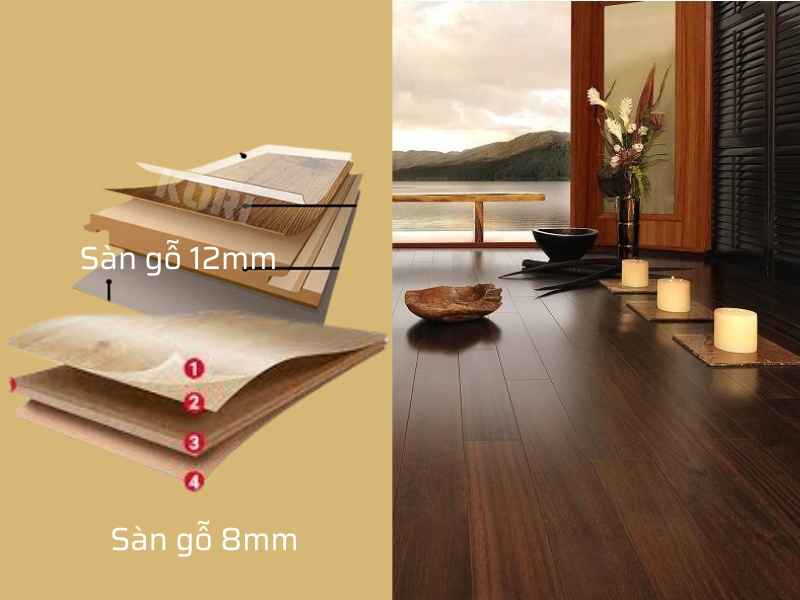 Độ dày của ván sàn (thường là 8mm, 12mm). Điều này ảnh hưởng đến cảm giác khi đi lại và khả năng cách âm.